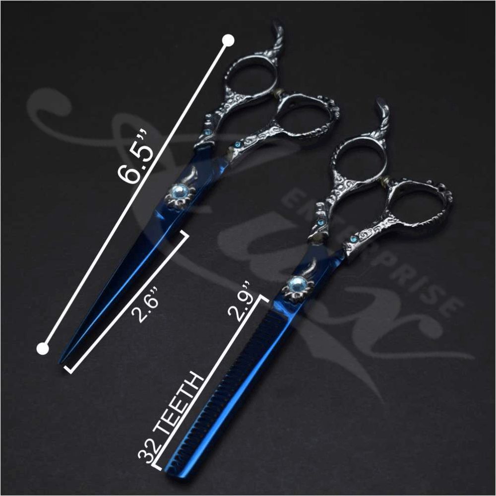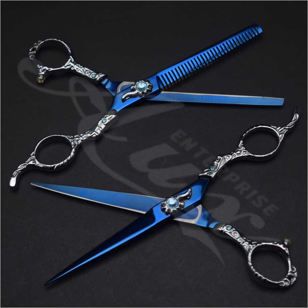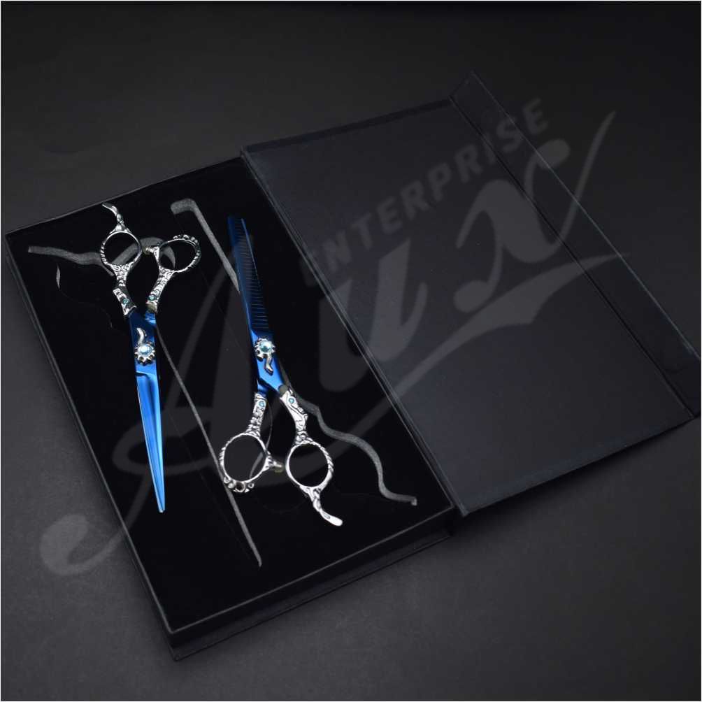 Embraided Handle Hair Dressing Scissors Set in Plasma Blue Color for professionals, a Set of Barber and Thinning Scissors that you will enjoy using.